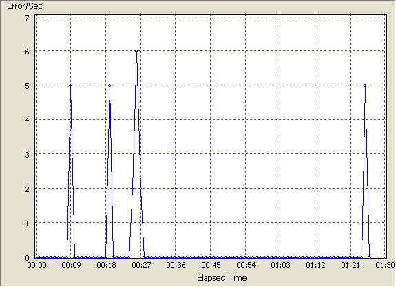 Different type of errors occurs during the simulation process like socket errors, receive time outs, HTTP errors. The Error/Sec graph represents any error occurs per second. Socket Error/Sec graph shows only the socket error occurs per second, Receive timeout Error/Sec graphs shows number of timeout occurs per second, HTTP Error/Sec graph shows the number of HTTP error occurs per second.