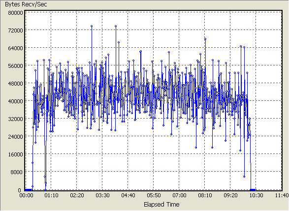 Bytes Recv/Sec graph shows the the amount of throughput on the server during each second of the simulation process. The amount of data received from the web server at any give second.