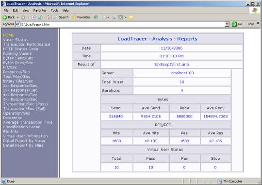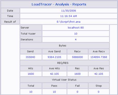 Analyzer will produce many types of graph and reports for analysis purpose. These reports can be exported HTML format. Reports are based on virtual user detail, request detail, classification-based reports and summary reports.