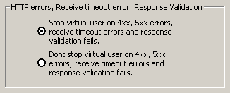 During simulation process errors may occurs like, HTTP error like client side error with 4xx error code and server side error with 5xx error code, receive time out error and Response Validation fail, to stop the vuser during these errors use first option. To continue even these error occurs use second option.