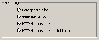 During simulation process full vuser log can be generated which contains request header, response header and html content. To log only HTTP header information use third option. To log HTTP header and full content for error use fourth option.