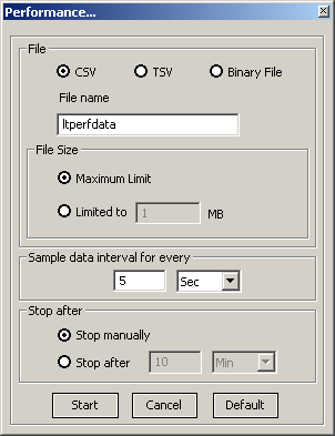 counters by clicking the check boxes, and then go to Performance -> Start... A dialog box shows the performance log settings, click Start to begin the logging process. To stop