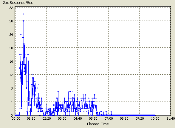 The Response per second graph shows the number of successful HTTP response given by the Web server during each second of the simulation process.