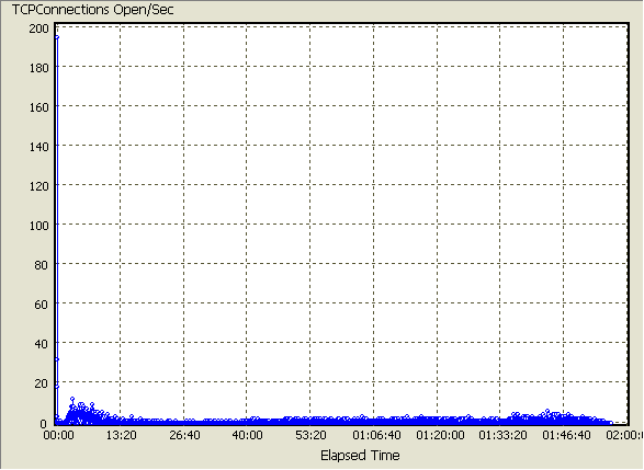 During simulation process number of Tcp connections get open and closed frequently and stay open for a period of time. These three graphs represent number of TCPConnections Open/Sec, number of TCPConnections Close/Sec, and TCPConnections which represents number of TCP Connections in open state at any time.