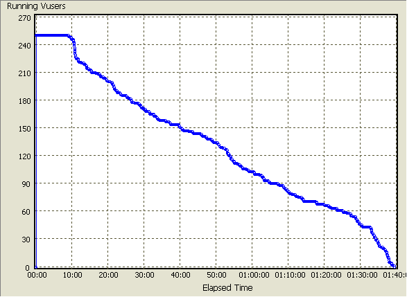 The Running Vusers graph displays the number of Vusers that are currently running. This graph is useful for determining the Vuser load on your server at any given time.