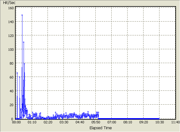 The Hits per Second graph shows the number of HTTP requests made by Vusers to the Web server during each second of the simulation process.