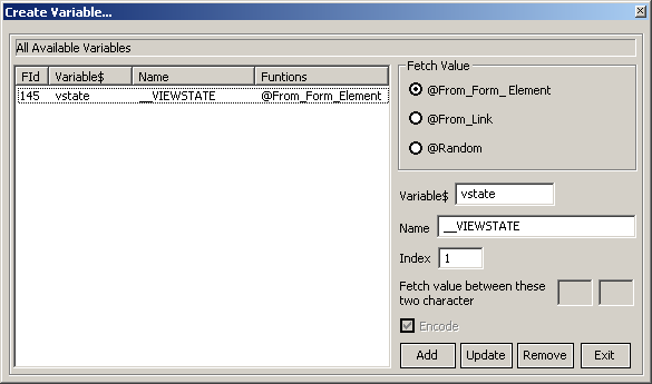 Variable$ field and Name field will be depends on the type of funtion used which will be discussed later. Index default value will be 1 for example its possible in HTML there will be two text box with same name, if value has to be extract from second text box index value should be 2. The