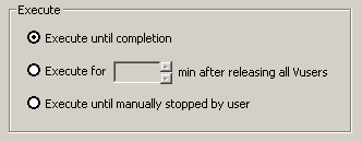 The default option is execute until completion, the simulation process start once completed it end the process. Using second option execute for N minute after releasing all vuser once all the vuser moves from the ready state to running state it should simulate for N min. If the third option is used the simulator will never stop user has to stop the simulation process manually by pressing stop button.