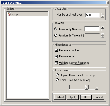 After creating new test the settings of the each script in the test can be modified using 'Test Settings' dialog box.
